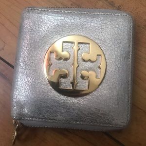 A silver wallet with a gold emblem on the front is lying on a wooden surface. | Tory burch wallet | baaec1c640169fbff6170b170891e15491eacdd766eec1f836361656d083c78a | 001065754092 | 0 | 0 | 16 | 3 | 0 | 0 | |