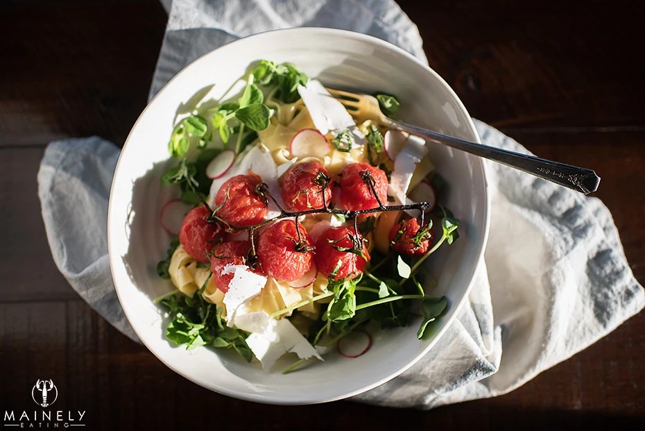 A bowl of salad with arugula, cherry tomatoes, and shaved white cheese is placed on a wooden surface. A fork is resting on the edge of the bowl. The bowl is on a white cloth napkin, and there is a shadow cast on the table. | Light summer pasta with blistered cherry tomatoes, pea shoots and ricotta salata in a lemony broth | c1d700d97ce0ae473b6b39972e0def29d01248b48419aca3463e4c511289ffa1 | 001065754149 | 0 | 0 | 45 | 16 | 0 | 0 | |