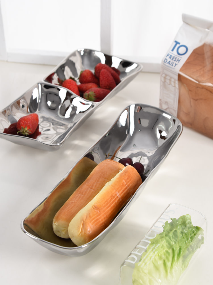 A meal consisting of a hot dog in a bun, a small salad, and a plate of strawberries is displayed on a white table. The hot dog is placed in a silver tray, and the salad is in a clear plastic container. The strawberries are in a silver bowl. There is also a loaf of bread and a bag with the word 'TO' on it. | Simple Ceramic Silver Bread Tray | dbefce0190d1d0b742efd12382f65acb702c7414f78aff31786205f108b711f3 | 001065754546 | 0 | 0 | 65 | 5 | 0 | 0 | |