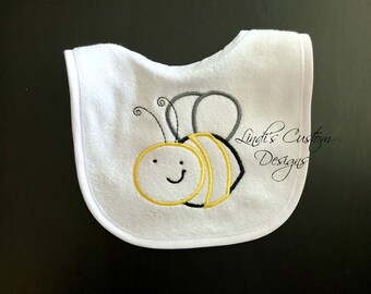 A white bib with a cute bee design is laid out on a dark surface. The bee has a yellow body with black stripes and wings, and a smiling face with black eyes and a black mouth. The bib has a decorative border with the words 'Lucy's Custom Designs' written in cursive script. | Bee Baby Bib, Gender Reveal Baby Bib, What Will it Bee Gift, Neutral Baby Gift, Bumble Bee Embroidered Baby Bib, Unique Baby Gift, Unisex | 09e5c79edfb70e2100ece5b6dd3e5b73d1a4112c3f00c4a84cc75ab40ed769fb | 001065754615 | 0 | 0 | 53 | 24 | 0 | 0 | |