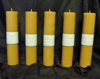 A set of five identical candles with yellow wax and white labels are arranged in a row on a black surface. Each candle has a lit wick at the top, and the labels read 'ESSENTIAL BEAUTY' in white text on a blue background. | 100% Pure Beeswax 9 Inch Pillar Candle 5 Pc Set | eef21f4871a674b0f44021fe152d9f43721883211f026d59560ea2122e5049ed | 001065754350 | 0 | 0 | 43 | 10 | 0 | 0 | |