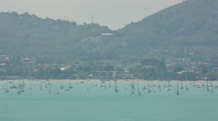 Aerial view of a large body of water with numerous sailboats scattered across the surface. The water is calm, and the boats are of various sizes and colors. In the background, there is a mountainous landscape with a mix of green and brown hues. The sky is clear, and the overall scene conveys a sense of tranquility and leisure. | Summer yacht and sailboat park coast line panorama hd phuket thailand Stock Footage | 5ff291251aee195ca9eb82459e05c62c78fb3afe920a1170213ab216c082c9e1 | 001065754872 | 0 | 0 | 59 | 13 | 0 | 0 | |