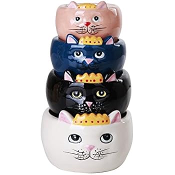 A stack of four ceramic cat-shaped containers with different colored lids. Starting from the bottom, the first container has a pink lid with a cat face, the second has a blue lid with a cat face, the third has a yellow lid with a cat face, and the top container has a black lid with a cat face. Each container has a cat face on the front with a crown on its head. | Adorable Queen Cats Nesting Measuring Cup Set of 4 Creative Functional Kitchen Decor | 7745367684e580fb9df11ddfeb0d7ffedb6e68c0ce05a111cb629ad6ecdbc70b | 001065754880 | 0 | 0 | 73 | 13 | 0 | 0 | |