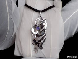 A close-up of a silver necklace with a detailed pendant featuring a dragon design, set with blue gemstones, hanging from a white shirt with a ruffled collar. | 'Illumi', handmade sterling silver pendant by seralune | 69da61c18bafac68a3d0a8be4991f4b2c73c826ec2475b43c430f813e4896064 | 001065754833 | 0 | 0 | 27 | 7 | 0 | 0 | |