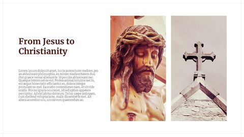The first image is a split-page design with a detailed illustration of a bearded man with a crown of thorns on the left side, and a cross on the right side. The text 'FROM JESUS TO CHRISTIANITY' is prominently displayed at the top of the left page, with additional text in a foreign language below it. The right page features a cross with a sword and a shield, and the text 'LESIONE DELLA CRUCIFISSIONE' is visible at the bottom. | Christianity Google Slides Presentation_04 | 353661feec9d93e1f39aaf9689dabe26acbab2bb35c68cd1c323cb0dc091696a | 001065754846 | 0 | 0 | 79 | 4 | 0 | 0 | |