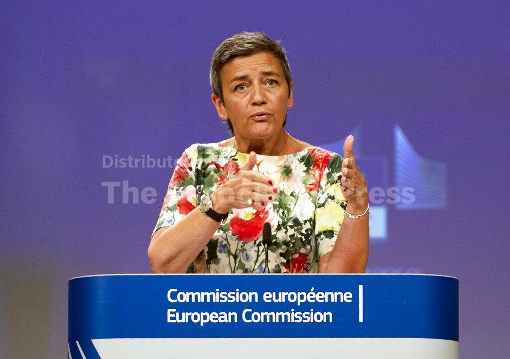 A woman with short hair is standing behind a podium with a blue and white sign that reads 'COMMISSION EUROPEENNE' in white letters. She is wearing a floral dress and has her hands raised as if she is speaking. The background is a plain blue wall. | FILE - In this Thursday, July 18, 2019 file photo, European Antitrust Commissioner Margrethe Vestager talks during a news conference at the European Commission headquarters in Brussels. The European Union\xe2\x80\x99s powerful competition chief has indicated she\xe2\x80\x99s looking at expanding regulations on personal data, dropping an initial hint about how she plans to use new powers against tech companies. Margrethe Vestager said Friday, Sept. 13 while Europeans have control over their own data through the EU\xe2\x80\x99s existing data privacy rules, they don\xe2\x80\x99t address problems stemming from the way companies use other people\xe2\x80\x99s data. (AP Photo/Francisco Seco, file) | 8dd2eb5d8768a9fc2b873d61cceadb0be6f09c3eef1bdad12e8d029e0791a3ba | 001065754813 | 0 | 0 | 46 | 96 | 0 | 0 | |