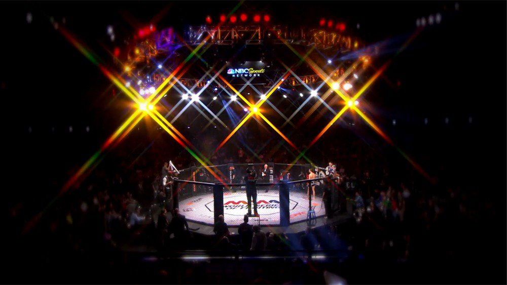 The first image depicts an indoor arena with a boxing ring at the center, surrounded by a crowd of spectators. The ring is illuminated by bright lights that create a starburst effect on the ceiling. The audience is in the background, and the overall atmosphere is vibrant and energetic. | WATCH LIVE: World Series of Fighting 26 featuring Lance Palmer vs. Alexandre de Almeida. tw.nbcsports.com/wsR | da78bb12c783a32a826c535aad7d611508b6410940de43a088bb8db767454838 | 001065754807 | 0 | 0 | 49 | 15 | 0 | 0 | |