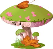 A whimsical illustration of a mushroom with a large, green cap adorned with pink and white spots and a brown stem. The mushroom is surrounded by a grassy field with a few fallen leaves and a single butterfly resting on the cap. | Mushrooms Royalty Free Stock Photography | 66d0d88ba21a3bdd2a533dc168f664b5492cda2f07f194d6b63c807ecbf4746c | 001065754826 | 0 | 0 | 42 | 5 | 0 | 0 | |