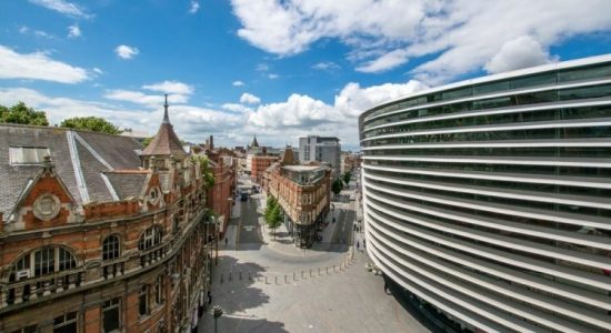 A bustling city street scene with a mix of old and new architecture. The foreground shows a red brick building with multiple windows and a balcony. The middle ground features a modern glass building with a reflective surface, and the background reveals a cityscape with various buildings, some with pointed roofs. The sky is partly cloudy, and the street is busy with people and vehicles. | LEICESTER NAMED ONE OF THE TOP 5 CITIES IN THE UK TO START A BUSINESS IN 2018 | 4662caf2f4dd20384ec069646ae70ad7fec883165b1e2cc0d6a96d6f380443de | 001065754820 | 0 | 0 | 65 | 17 | 0 | 0 | |