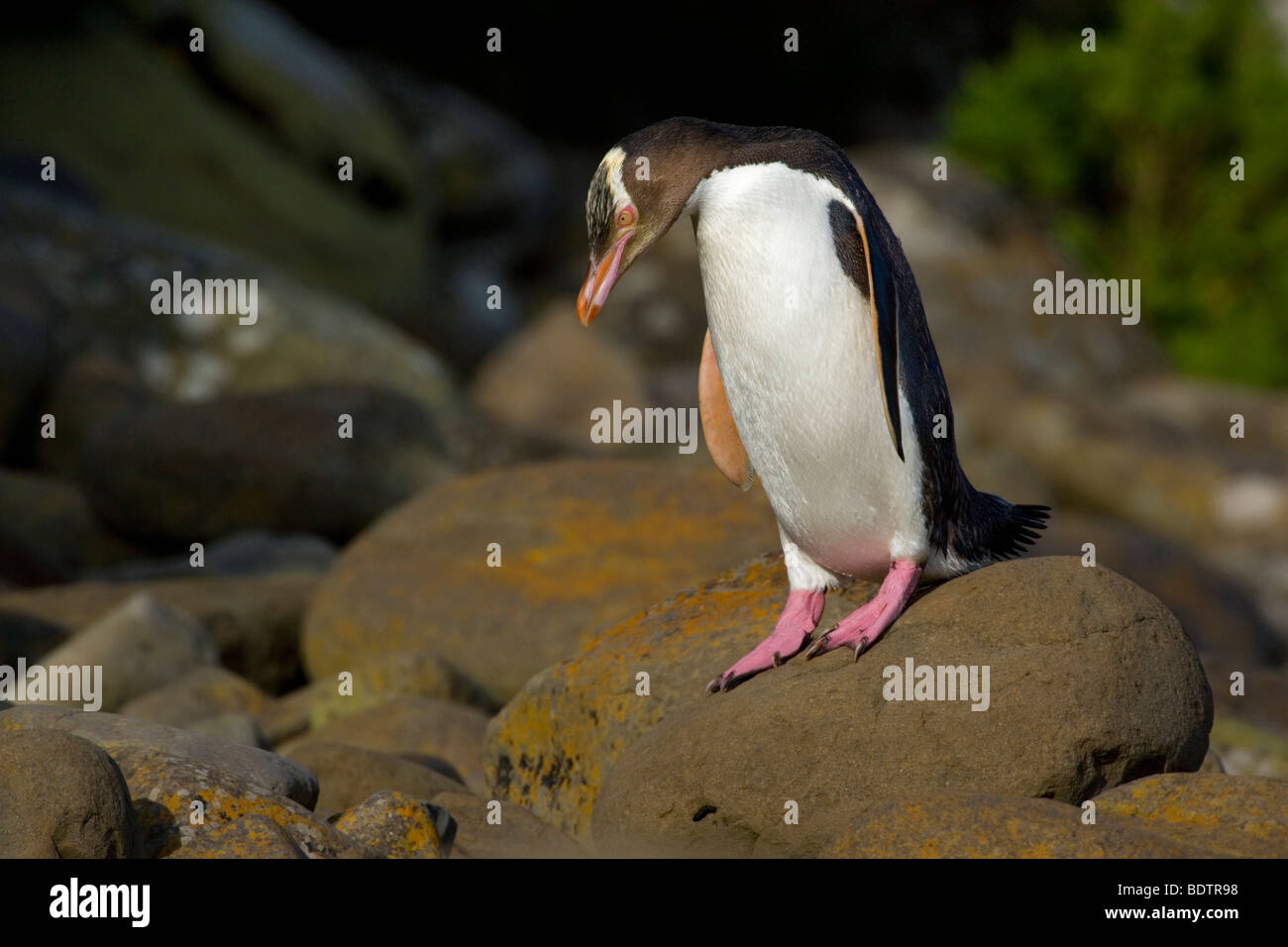 A penguin stands on a rocky shore with its beak open, surrounded by various sizes of rocks and a hint of greenery in the background. | yellow-eyed penguin, (megadyptes antipodes) new zealand, south island, curio bay Stock Photo | 8a591d3789c7f439046ffa9ab40c3e8379c4b2bd373689f56de34d203ba3a612 | 001065754999 | 0 | 0 | 25 | 12 | 0 | 0 | |