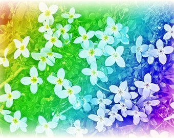 A close-up image of a field of white flowers with a rainbow gradient overlay. The flowers are in focus, and the background is blurred, with the rainbow gradient adding a colorful effect to the image. The colors of the rainbow are visible in the upper left corner, transitioning from red to orange, yellow, green, blue, and purple, and then back to white. | Rainbow flower art | 80f9b53c55ab756a7ff511b465ab4b6b46e962d68bbdff29e8eac1ae0a232ce7 | 001065755040 | 0 | 0 | 62 | 3 | 0 | 0 | |