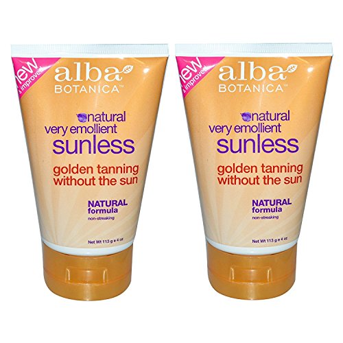 Two identical bottles of Alba Botanica Very Emollient Sunless Golden Tanning Lotion are displayed side by side against a white background. Each bottle has a pink cap and is filled with a golden liquid. The label on the bottles features the brand name 'Alba Botanica', the product name 'Very Emollient Sunless', and the tagline 'Golden Tanning Without the Sun'. The bottles are positioned with the labels facing forward, and the caps are on top. | Order Alba Botanica Alba botanica natural very emollient sunless tanning lotion with natural formula 4 oz 113 g pack of 2 | c6c2fbdb54704b7b27fbf6d8c5f8e1513fec413012946223185fa267660dfde9 | 001065754993 | 0 | 0 | 74 | 21 | 0 | 0 | |