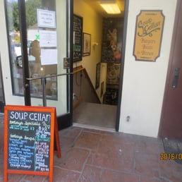 The first image shows the exterior of a building with a sign that reads 'Soup Cellar' in white letters on an orange background. The sign is placed on the sidewalk, and there is a chalkboard menu with various soup options listed below it. The building has a wooden door with a metal handrail attached to it, and there are several framed pictures and a menu board visible through the window. The scene appears to be set during the day, and there are cars parked in the background. | Photo of The Soup Cellar - Leavenworth WA United States & Photos for The Soup Cellar - Yelp | 4ea5038009e300646d59ef5f25f495e6b63afb2a8571a21077364566353dbbc1 | 001065754973 | 0 | 0 | 87 | 18 | 0 | 0 | |
