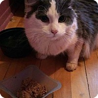 A grey and white cat is sitting on a wooden floor next to a bowl of food. The cat has a pink nose and is looking directly at the camera. The bowl of food is placed on the floor, and there is a black bowl in the background. | Adopt A Pet :: Leonardo DiFluffio - THORNHILL, ON | 18fee7dc3c13b3400ad09ffd9ca2188221eb0c9b88c0cf5d8582638b470e9477 | 001065754945 | 0 | 0 | 48 | 9 | 0 | 0 | |