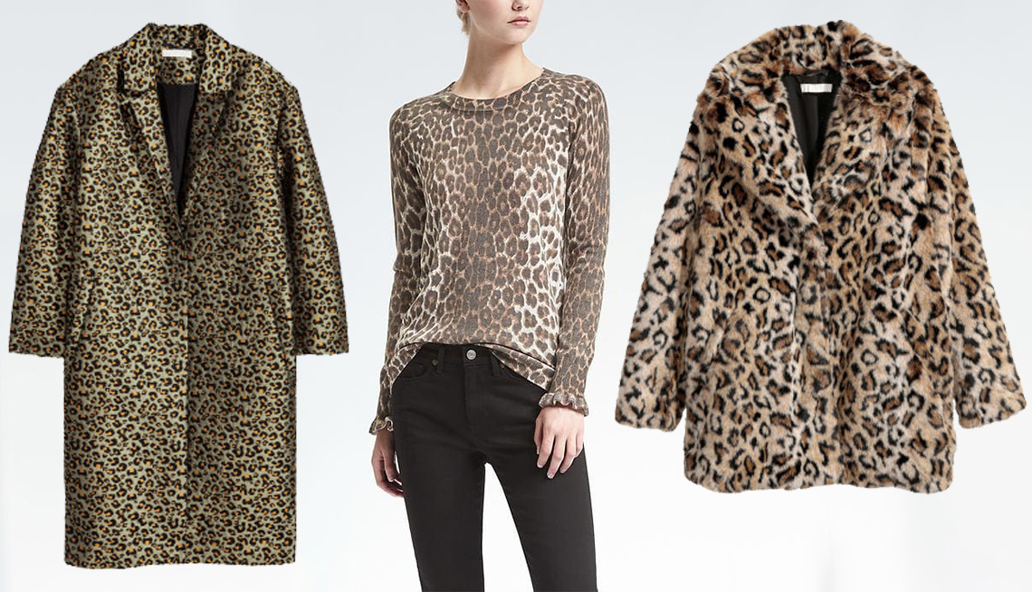 A model is wearing a white top with a pattern of small, dark leopard spots, paired with black pants. She is standing in front of a white background with two coats displayed beside her. The coat on the left is a brown leopard print coat, and the coat on the right is a white fur coat with a black collar. | (L-R) Jacquard Weave Coat by H&M; Superloft Ruffle Cuff Crew by Banana Republic; Leopard Faux Fur Jacket by H&M. | a8d24ad932aeeb31e0e2ee8971a33b297d9262cfa923d8adf2b3e4ac711c54f4 | 001065755302 | 0 | 0 | 60 | 19 | 0 | 0 | |