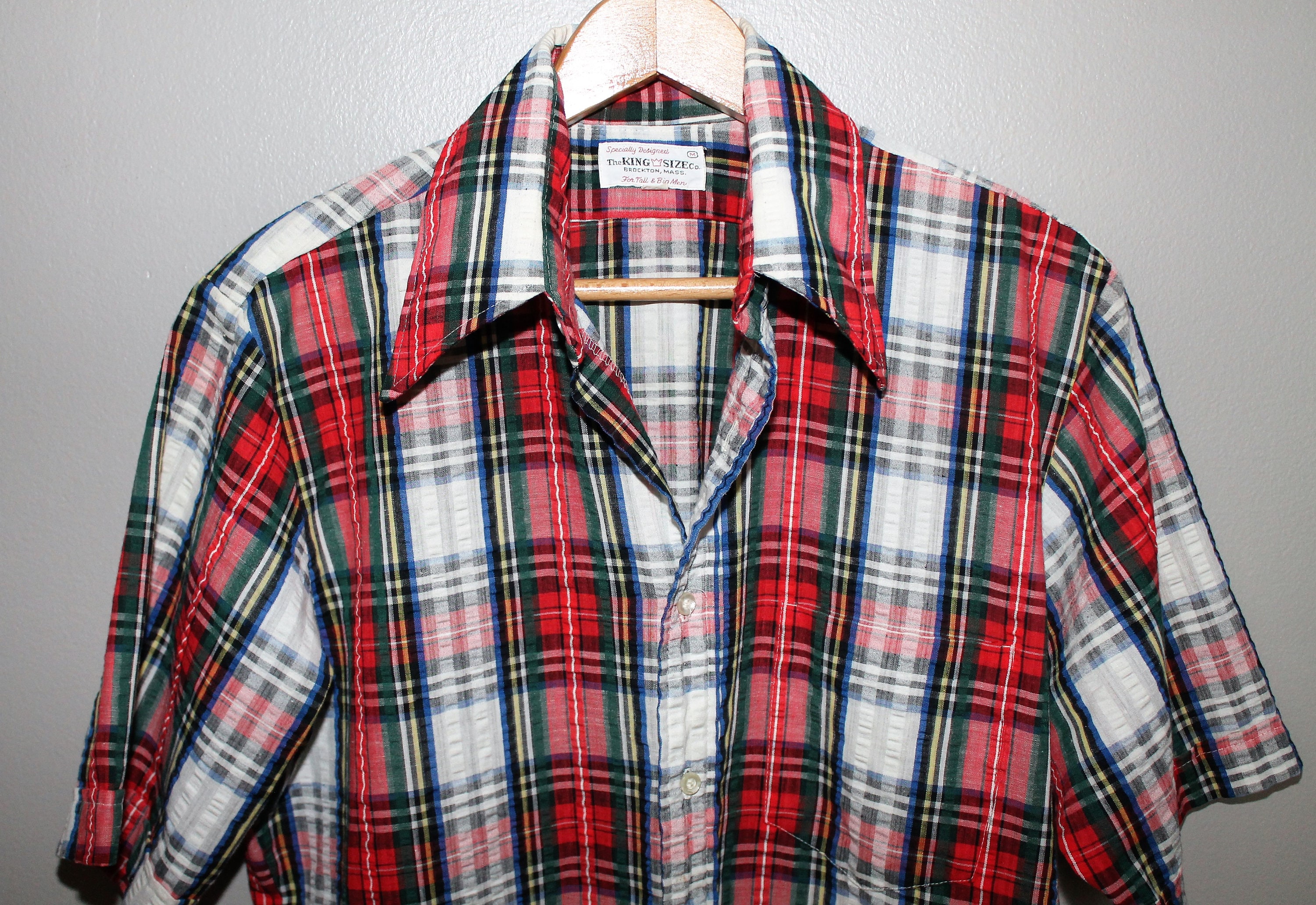 A red and green plaid shirt with a white collar is hanging on a wooden hanger against a white wall. The shirt has a buttoned front and a tag on the collar. | e4b39428c Vintage 50s 60s Rockabilly Red Blue Madras Plaid Shirt M Big Tall ... | 0b4c960ec27ff246f11c5e34aeacac1f62bc6562cd65fcc80db4b63f68e576dd | 001065755151 | 0 | 0 | 32 | 14 | 0 | 0 | |