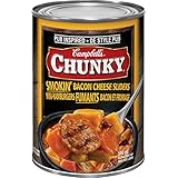 A can of Campbell's Chunky Smokin' Bacon Cheese Sliders soup is displayed with a spoon inside the can, showing the soup's contents. The can has a black background with the brand name 'Campbell's' and the word 'Chunky' in red, along with the phrase 'Smokin' Bacon Cheese Sliders' and 'Smoky Bacon, Chunks of Potatoes, and Chunks of Carrots in a Hearty Beef Broth' written in white text. The image is well-lit and appears to be a product advertisement. | Campbell's Chunky Smokin' Bacon Cheese Sliders, 540ml | 9d54c9ac7b8c66731cc482ab772e47f14035b9c5430e617888c4e602f5573024 | 001065755421 | 0 | 0 | 77 | 7 | 0 | 0 | |