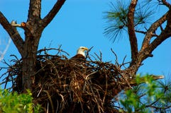 A bald eagle is perched on a tree branch with a nest. The nest is made of twigs and branches, and the eagle is looking to the side. The tree has a thick trunk and the leaves are green. The background is a clear blue sky. | Homeland Security - Guarding the nest. An American Bald Eagle sits on it's nest in Punta Gorda Florida Stock Image | 95c4424a155141ca4ad8381dbfe85710ad46763899ac039ac032050761dac916 | 001065755441 | 0 | 0 | 46 | 20 | 0 | 0 | |