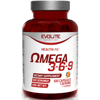 A red bottle with a silver cap is filled with a red liquid. The label on the bottle has a white background with red text and a logo that reads 'Evolite Nutrition'. The text on the label includes 'Healthline Omega 3-6-9', 'Dietary Supplement', '100 servings', '100 capsules', and '150 capsules'. There are also images of fish and a heart on the label. | Omega 3-6-9 (100kaps/100serv) Evolite EU | f7ad568fe67eb16d74bff8b1d8d877d81f909757e82f8941c8bad3b7b9c27805 | 001065755430 | 0 | 0 | 62 | 5 | 0 | 0 | |