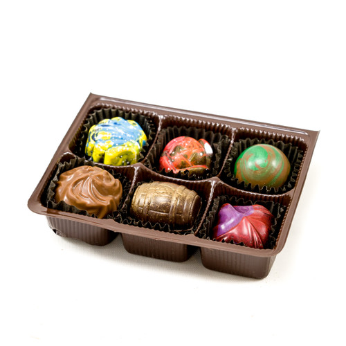 A chocolate box filled with assorted candies is displayed against a white background. The candies include a variety of colors and shapes, such as a yellow swirled candy, a red and green swirled candy, a brown and orange swirled candy, and a green and purple swirled candy. The box has a brown color and is divided into six compartments, each containing a different candy. | 6 pc Truffle Box | 6958e9414f7d44c7f573319bfa7a5c03f35459e85f2e754cdd85c34b6769f7c8 | 001065755751 | 0 | 0 | 64 | 4 | 0 | 0 | |