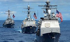 A fleet of three US Navy warships is sailing on the ocean. Each ship has multiple flags, including the American flag, flying at the front. The ships are equipped with various antennas and radar systems, and they are moving through the water with a trail of white foam behind them. The sky is clear with a few clouds, and the ocean is calm. | US Navy Fleet | 2873f9edd003dfc783b841efe60b993927bcd2cc32a0076a45ea5657320c76c7 | 001065755800 | 0 | 0 | 63 | 3 | 0 | 0 | |