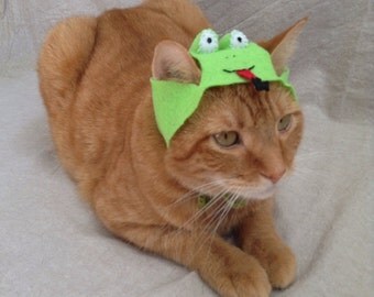 A ginger cat with a green frog hat is lying down on a white surface. | Frog Hats for Cats | 28dee4bdbdf3019931115f282909fa4bed06a3be33d11399f5e9e13aa790f1ec | 001065755799 | 0 | 0 | 15 | 4 | 0 | 0 | |