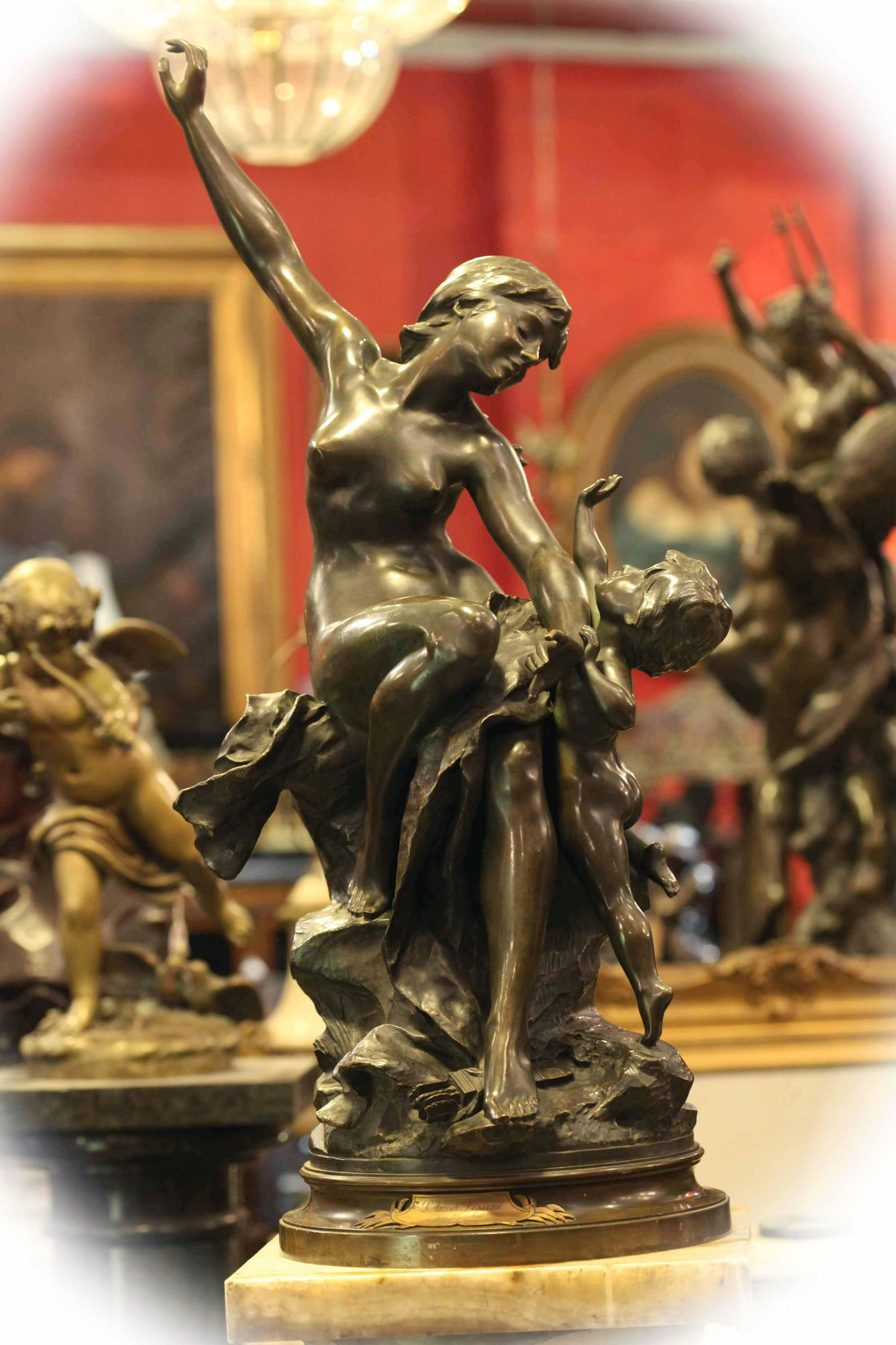 A bronze statue of a woman in a dynamic pose, with her arm raised and her hair flowing behind her, is displayed on a shelf. The statue is part of a collection of various bronze figures, including a man in a hat and a woman in a dress, all with intricate details and textures. The shelf is adorned with a decorative frame and a circular plaque, and the background features a red wall with a painting. | 19 C bronze with brown patina sculpture group, signed | 22b0b699c20cc2fd8d58ea9f2929c453ad630e7c6c12fa7571983c3e3389cf85 | 001065755785 | 0 | 0 | 76 | 9 | 0 | 0 | |