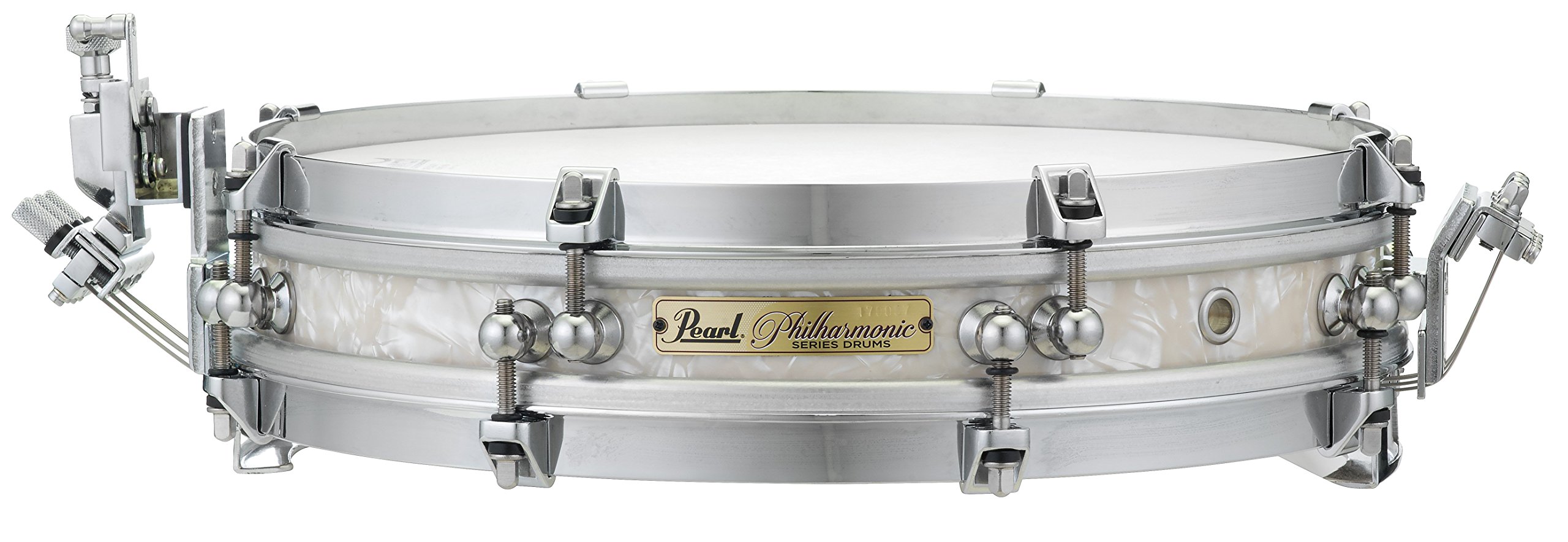 A close-up image of a silver drum with a white pattern on the surface. The drum has a shiny metallic finish and is mounted on a stand with silver hardware. The drumhead is taut and appears to be made of a thin, translucent material. The word 'Ludwig' is engraved on the bottom of the drum, along with the numbers '1960' and 'D'. | Pearl Philharmonic PHP-1325/C405 13 x 2.5 ''Pancake'' Snare Drum | 397ff93e846093a17f6f4d9ae247a95bb05818a65b2208f36a476154756fa751 | 001229731373 | 0 | 0 | 62 | 9 | 0 | 0 | |