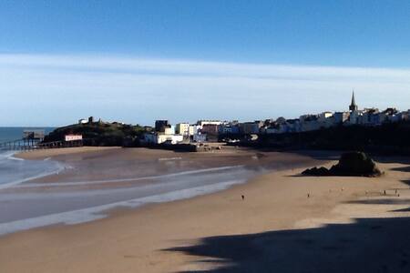 A serene beach scene with a clear blue sky and a few clouds. The beach is lined with a row of houses and a church spire is visible in the distance. The ocean is calm with gentle waves lapping onto the sandy shore. There are a few people walking along the beach, and a bird is seen flying low over the water. | Luxury gd floor holiday apartment - Tenby | 5ad8b7c7fd6ad2dea2d59b7bcb4a9caea0448b29604090def03630ecf93a829f | 001229731580 | 0 | 0 | 62 | 7 | 0 | 0 |
