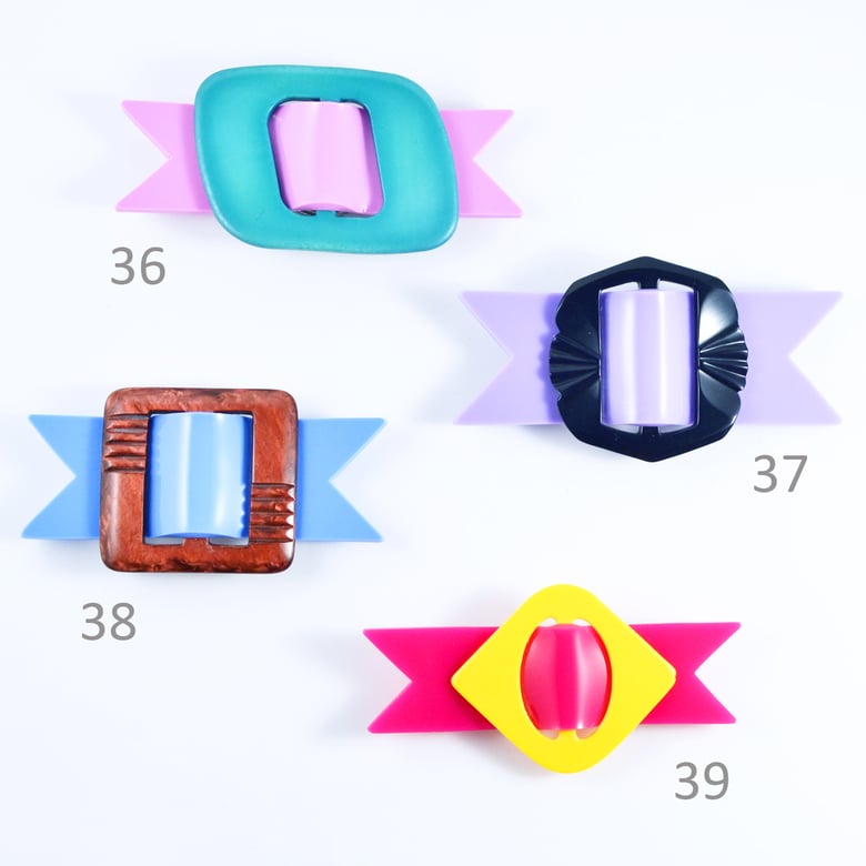 A collection of colorful, plastic, rectangular-shaped hair clips with ribbons attached to them, arranged on a white background with numbers 1 to 5 above each clip. | Image of Buckle Brooches 36 to 39 | 074ec4904fe39431e57eb6e9da97533fa924cac2c6b4ab38de20f2ed2c9fe1ae | 001229731388 | 0 | 0 | 26 | 7 | 0 | 0 | |