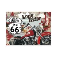 A vintage-style poster featuring a red motorcycle in the foreground with a Route 66 sign above it. The background includes a cityscape with buildings and a neon sign that reads 'Hotel'. The poster has a distressed, aged appearance with a red and white color scheme. | Magnet Lone Rider | 52945247fb051d1c4756db8faa0c0760feeef526d52038fe2b2d38762ce09880 | 001229731671 | 0 | 0 | 45 | 3 | 0 | 0 | |
