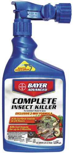 A bottle of insecticide with a blue label featuring the brand name 'Bayer Advanced' and the product name 'Complete Insect Killer'. The label includes a warning symbol, a list of active ingredients, and instructions for use. The bottle has a nozzle at the top and is placed against a white background. | Grub Insect Control (Bayer Advanced 700280 Complete Insect Killer for Soil and Turf Ready-To-Spray, 32-Ounce) | 84fcb16799c5920e984c0ee7b845534aedfcf9aed41caf9e3aa2d201404f144c | 001229731693 | 0 | 0 | 51 | 15 | 0 | 0 | |
