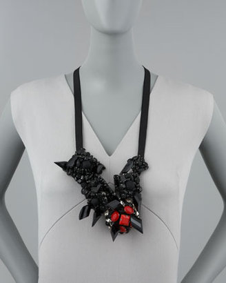 A mannequin is wearing a white top with a black and red feathered necklace. The necklace has a large black bow in the center with red accents and smaller black and red feathers hanging from it. The mannequin has its arms crossed and is positioned against a plain background. | Donna Karan Galactic Cluster Necklace, Black/Crimson | 68d8c573393c046d9e6914ae53118b632343a70b1c47d1eb3863d61060279fbf | 001229731771 | 0 | 0 | 49 | 6 | 0 | 0 | |