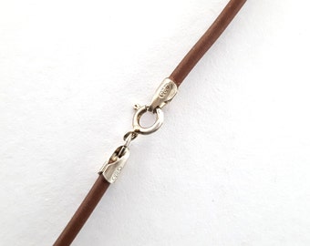 A close-up image of a silver ring with a textured surface, attached to a brown leather strap. The strap is lying on a white surface, and the ring is positioned in the center of the image. | Brown Necklace Cord, Rubber Cord Necklace, Rubber Cord 2mm, Plain Cord Necklace, Sterling Clasp, Interchangeable, Made in USA | 599e792ef8d2a61df53563fffe342af5d28c9ef815f4e57ce8a993bfcd5feb63 | 001229732203 | 0 | 0 | 36 | 18 | 0 | 0 | |