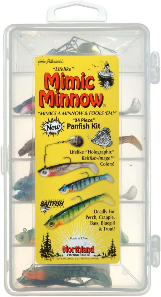 A plastic container filled with various lures, including spoons and minnows, is displayed. The container has a yellow label with the brand name 'Northland' and the product name 'Mimic Minnow'. The lures are arranged in compartments, showcasing different colors and designs. The background is a plain white color. | Pink Medium Mimic Minnow Tails Clear Northland Tackle Blue | 532528937f03d52946b4cd32962c3166d425100794822e9862d0d2bc68e2fe1d | 001229732294 | 0 | 0 | 48 | 9 | 0 | 0 | |
