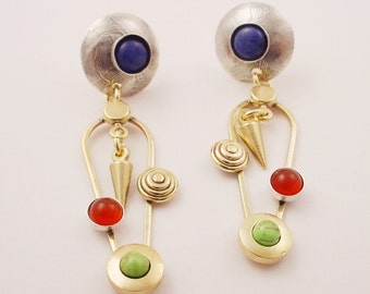 A pair of earrings with a modern design, featuring a combination of gold and silver tones. Each earring has a large, round, textured silver piece with a blue and red gemstone in the center, and a smaller, round, textured gold piece with a green gemstone in the center. The earrings are connected by a gold chain with a circular gold element and a red gemstone. | Sterling and Brass Dangle Earrings with Sodalite, Carnelian, Gasperite, and Brass Cone Dangles - Posts | e1d495aca2735e099647a9004c0c689e5dcf4fc16f5426b9031f7da1e64a96ec | 001229732361 | 0 | 0 | 65 | 15 | 0 | 0 | |