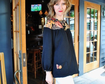 A woman with long hair is standing in a doorway, wearing a black top with a floral pattern and a white skirt. She has a red lip color and is wearing a bracelet on her left wrist. The setting appears to be a bar or restaurant with wooden furniture and a television in the background. | SALE/ Olga -Wool cardigan/ one of a kind Cardigan/ Hand made designer clothing/ Size Small-Medium | 535445ab9658ab01294318ddf06e927c8a56c3eeb1ae55d9e7746673ed61acdd | 001229732261 | 0 | 0 | 55 | 15 | 0 | 0 | |