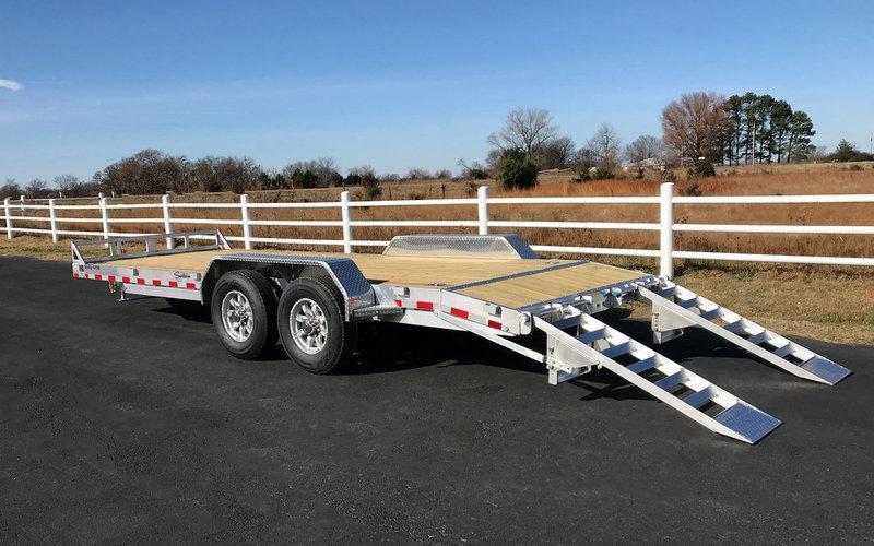 A silver trailer with a wooden bed is parked on a paved road next to a white fence. The trailer has a flatbed with a wooden surface and is equipped with a set of silver stairs on the right side. The background shows a rural landscape with trees and a clear blue sky. | 2019 Sundowner APU20BP 20' Aluminum Equipment Trailer | 40e0cd4ae3cbac9724c8babb5d5eb3eae937cf93409a791bfe96228218fce22a | 001229732422 | 0 | 0 | 53 | 7 | 0 | 0 | |