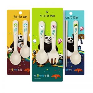 A set of three colorful plastic spoons with panda designs on the handles, each in a different color: yellow, green, and blue. The spoons are packaged in individual plastic sleeves with a decorative background featuring pandas and other cartoon characters. The packaging includes Chinese characters and a logo at the top. | Suncha Rice Husk Fork and Spoon Tableware Set - | 64029a4d65b6463338357704c4ce63759b197101c16aaf87cf4d789ff18ba6c1 | 001229731935 | 0 | 0 | 51 | 9 | 0 | 0 | |