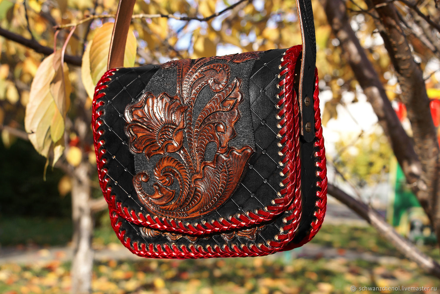 A black leather handbag with red stitching and a decorative floral pattern is hanging from a tree branch. | Women's leather bag 'Black and red', Classic Bag, Krasnodar, \xd0\xa4\xd0\xbe\xd1\x82\xd0\xbe \xe2\x84\x961 | 09412b19920194e2e00ba30b9ab9fc9c7301dbf62307b516869d50c46247aaf7 | 001229732466 | 0 | 0 | 18 | 11 | 0 | 0 | |