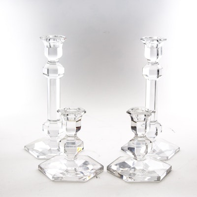 A pair of crystal candle holders with intricate designs and a reflective surface are placed on a white surface. Each holder has a small, round base and a tall, slender body that flares out at the top, where a candle would be placed. The holders are positioned side by side, and the background is a plain, light-colored surface. | Val St. Lambert Crystal Candlesticks | 175e20ec27bbc9cf141c8e035f035732d1d31fa043fbc4636d8e84ab6bc63731 | 001229732531 | 0 | 0 | 58 | 5 | 0 | 0 | |