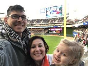 A man and a woman are standing next to a young girl, all smiling and posing for a photo. They are at a baseball stadium, with a large screen displaying a baseball game in the background. The man is wearing glasses, a scarf, and a jacket, while the woman is wearing a scarf and a jacket. The young girl is wearing a scarf and a jacket as well. They are all looking towards the camera, and the man is holding a smartphone to take the photo. | Ter\xc3\xa9sa attended Minnesota Twins vs. Baltimore Orioles - MLB on Apr 26th 2019 via VetTix | e83ebbe48c1af11cf01a0573d9d1fe1666dd846adb6be8f0fff210d6fdf28350 | 001229732533 | 0 | 0 | 86 | 15 | 0 | 0 | |