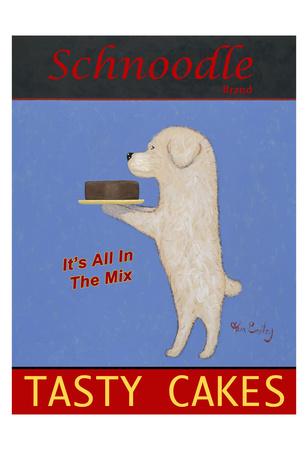 A stylized illustration of a white dog with a brown nose and ears holding a slice of cake on a plate. The dog is standing on its hind legs, and the background is a blue gradient with the words 'Schmoodle' at the top and 'Tasty Cakes' at the bottom. The text 'It's all in the mix' is written below the dog. The image has a textured appearance, and there is a signature at the bottom right corner. | Schnoodle Tasty Cakes | c05a38035dcc951d582c76d8b53f919604b0f80e6e7181c6698f7cfeb0266df1 | 001229732612 | 0 | 0 | 77 | 3 | 0 | 0 | |