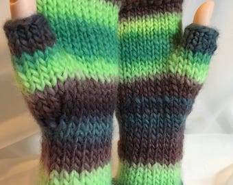 A pair of knitted gloves with a striped pattern in shades of green, brown, and grey. The gloves are held up with fingers spread apart, showcasing the texture and color of the knitting. The background is a plain, light-colored surface. | Hamd spun hand knit muffatees, fingerless gloves variegated teal, green, gray and mauve. Pill resistant. | 413d0984980a66cb2b020f01fa4104119db0d52430f939d1857359853eba6f67 | 001401440659 | 0 | 0 | 40 | 15 | 0 | 0 | |