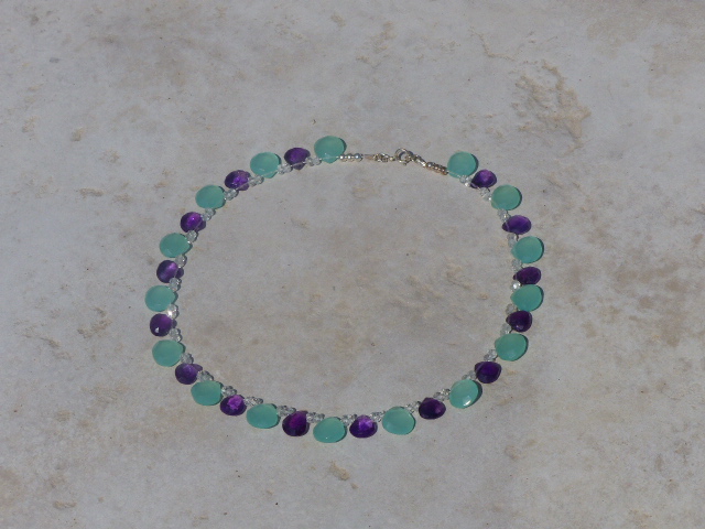 A bracelet with alternating purple and green beads is lying on a textured surface. The bracelet is made of a combination of purple amethyst and green jade beads, with a silver clasp. The beads are of various sizes, and the clasp is positioned at the top of the bracelet. The surface has a rough, stone-like texture with ... | Aqua Blue Chalcedony Heart + Amethyst Heart Necklace - top + side | 45f508eefd77f1f0ca0ecbd108636de7c1c2f3a4a937b18c97b413529798aee9 | 001401440635 | 0 | 0 | 61 | 12 | 0 | 0 | |