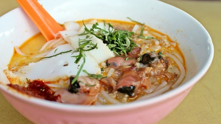 A bowl of soup with noodles, meat, and vegetables is placed on a table. The soup has a reddish-orange broth and is garnished with green herbs. A spoon is resting on the rim of the bowl. | Top Hawker Stalls For The Best Laksa In Singapore | 1822e5c0eab390db5f4ec22ab0eacbf63f98ad4ac66fe6b7cda1f8c7a99d4db5 | 001401441020 | 0 | 0 | 36 | 9 | 0 | 0 | |