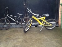 A yellow bicycle with a black seat and handlebars is parked next to a black bicycle with a black seat and handlebars. Both bicycles are leaning against a dark-colored garage door. | 2 boys bicycle | 14d6c3f563228f270523b5d559d56556ded061cc3daf1d650e575cb61b1032c7 | 001401442057 | 0 | 0 | 31 | 3 | 0 | 0 | |