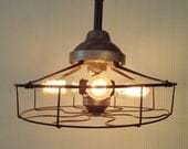 A vintage-style lamp with a metal cage-like structure and a single bulb is hanging from a ceiling. The bulb is lit, casting a warm glow and creating a soft shadow on the wall behind it. The lamp has a classic design with a round base and a curved, metallic shade that is slightly tarnished, giving it an antique appearan... | R&M. INDUSTRIAL Vintage LIGHT Shown with Edison Filament Bulbs | a043ca4dfd71f2f441bb46dbdd3b2e8baeff7d84e65ed417b8292d778b196dcd | 001401442309 | 0 | 0 | 59 | 9 | 0 | 0 | |