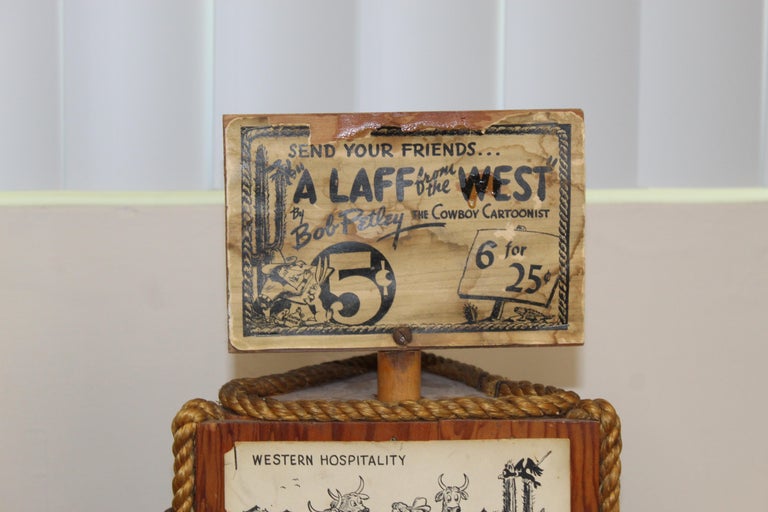 A rustic wooden sign with a weathered appearance, featuring a vintage design with text and illustrations. The sign is mounted on a wooden stand with a rope wrapped around it. The sign has a faded look with a white background, and the text reads 'SEND YOUR FRIENDS... A LAFF WEST' with a cartoonish illustration of a car ... | American 1940s Post Card Display Rack by Bob Petley For Sale | 73c2775bea2208d1958278304c232fbcc7a1cf756b8df64d67f359bcac20a15b | 001401442133 | 0 | 0 | 99 | 11 | 0 | 0 | |