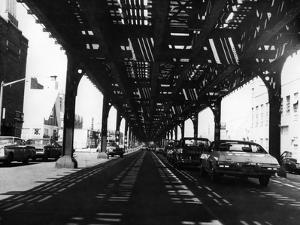 A black and white photograph of a city street scene with vintage cars parked on the side of the road. The street is lined with buildings and a train station with a large overpass. The sky is overcast, and the overall tone of the image is dark and moody. | Elevated Railroad by Peter Keegan | cc1c2bb1d3598d4fd1e22398222111727ac213ad45c0b64d17b95e47c8ef0fd7 | 001401442557 | 0 | 0 | 49 | 5 | 0 | 0 | |